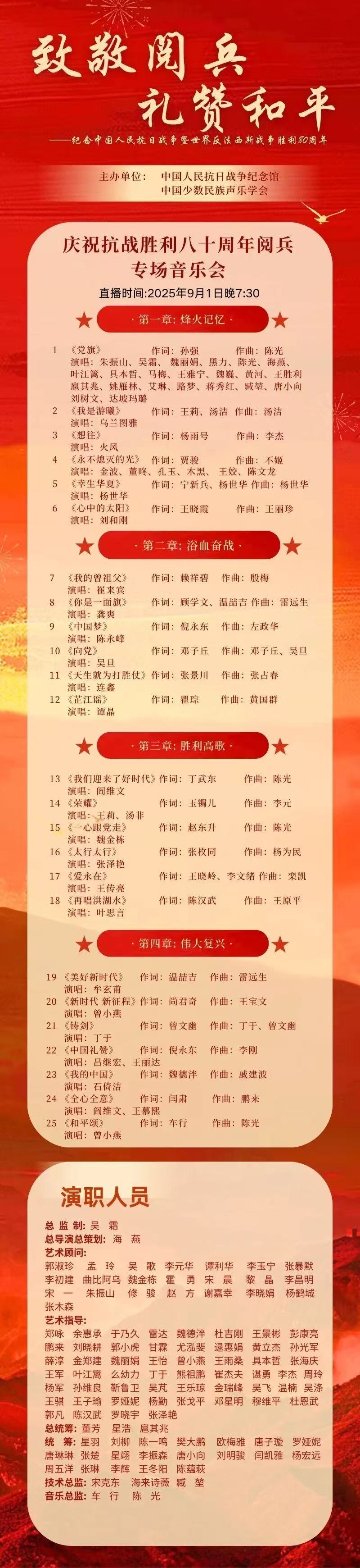 当晚,音乐会围绕“烽火记忆”“浴血奋战”“胜利高歌”“伟大复兴”四个主题展开,汇聚了全国优秀词、曲作家和歌唱家作品25首。音乐家们以赤诚之心倾情创作,为和平放声高歌,以激昂奋进的乐章带领广大观众回顾波澜壮阔的历史,感受先辈们不屈的抗争精神与炽热的爱国情怀。