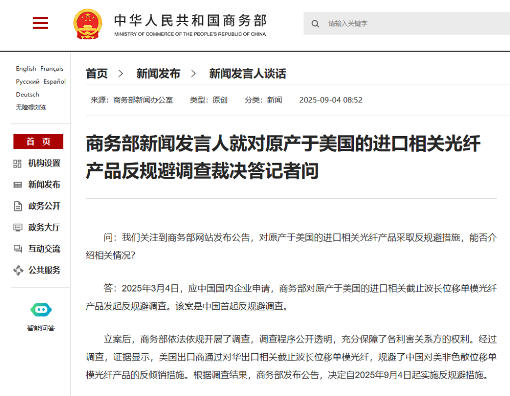 立案后,商务部依法依规开展了调查,调查程序公开透明,充分保障了各利害关系方的权利。经过调查,证据显示,美国出口商通过对华出口相关截止波长位移单模光纤,规避了中国对美非色散位移单模光纤产品的反倾销措施。根据调查结果,商务部发布公告,决定自2025年9月4日起实施反规避措施。