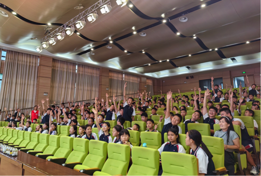 随后的互动问答环节将现场气氛推向高潮。“国际禁毒日是几月几日?”“发现有人吸毒该怎么办?”……面对一个个问题,同学们踊跃举手、流畅应答,展现出扎实的知识储备。活动最后,全体青少年一起进行禁毒宣誓,铿锵誓言回荡在学校礼堂,历史与现实在此交汇,先驱精神与青春力量完成了一次跨越时空的接力传承。