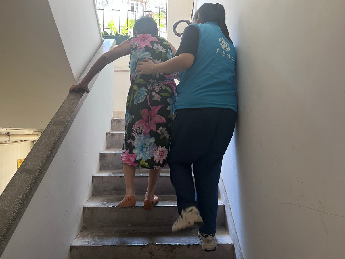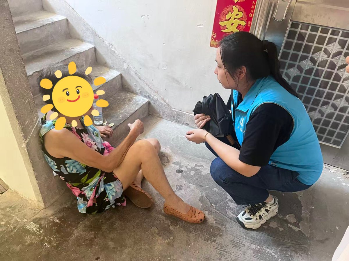 接到求助电话后,吉莲社区党委书记吴涛立即与“双百”社工小周赶往现场,抵达现场时,74岁的何姨正孤零零瘫坐在台阶上,脸上写满惊慌与无助。“阿婆您别慌,我们来了,先别着急动!”小周放缓语速,半蹲在老人身边轻声安抚。