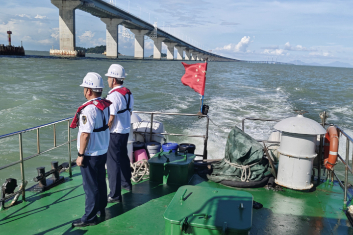 烟花燃放区域位于珠澳交界水域,因四条水道交汇、日常通航密度大、船舶类型复杂,水上交通组织难度较高。为确保安全,珠澳海事部门提前部署,通过智慧海事系统划定电子封航区实施远程监控,派出多艘海巡船艇现场不间断值守,动态维护核心区及周边通航秩序。