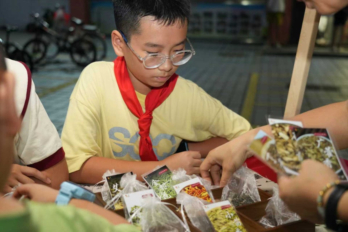 作为斗门青少年弘扬中华优秀传统文化季的活动之一,红领巾小集市精心设置了多个由少先队员组织的传统文化游戏摊位,让孩子们在玩乐中感受传统文化的魅力,激发他们的想像力和创造力。在“识中药”摊位前,孩子们围成一圈,好奇地闻着、看着艾叶、薄荷、广藿香等中药材,队员们耐心介绍这些中药材的功效,尤其是它们在驱蚊方面的妙用。在“甲骨文连连看”摊位,大家将甲骨文与对应的现代汉字进行匹配,感受古老文字的魅力。