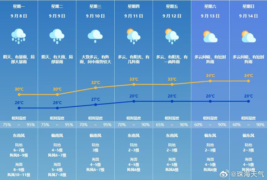过去1小时我市风力略有减弱,陆地风力6-7级阵风8-10级,沿岸及海面风力8-9级阵风10-11级,其中最强风力集中在荷包岛、万山区和港珠澳大桥,荷包岛录得最大阵风11级(31.9米/秒)。预计今天中午至下午我市风力基本维持,并伴有暴雨。