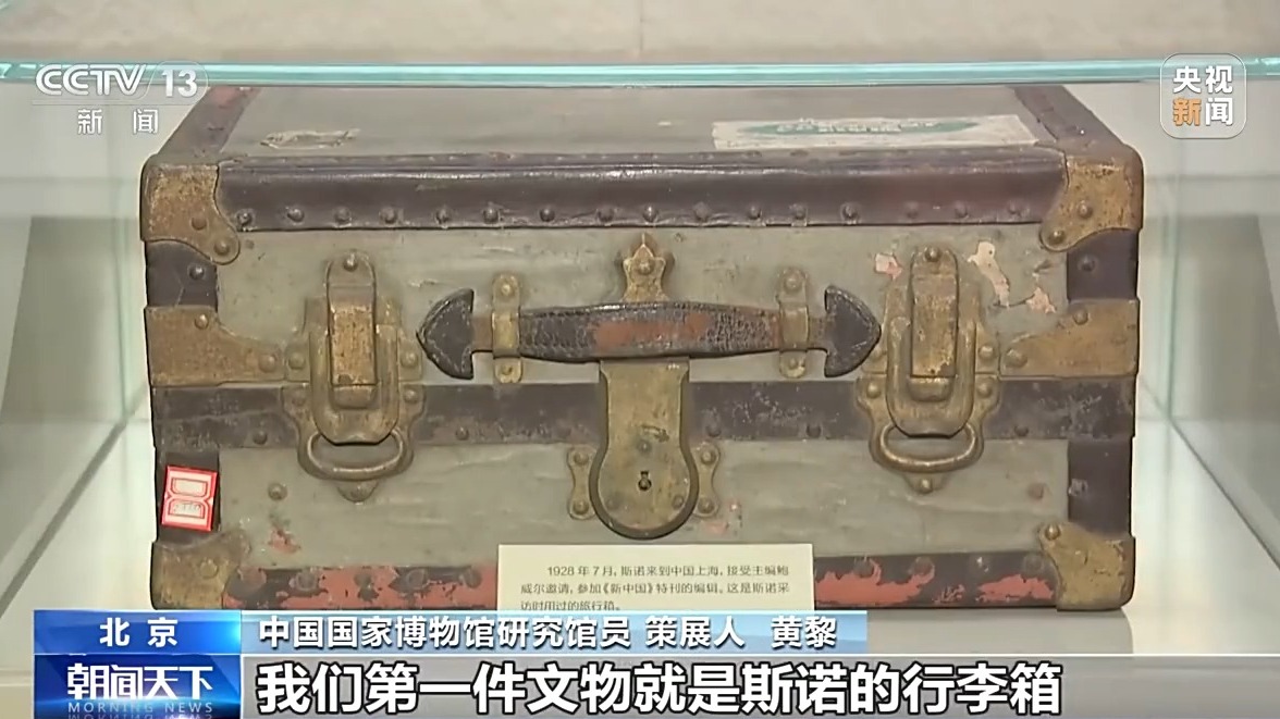 中国国家博物馆研究馆员、策展人黄黎:我们第一件文物就是斯诺的行李箱,当时全面抗战还没有开始,斯诺就已经敏锐地感觉到了这股力量,这本《红星照耀中国》,我们想通过文物,通过图片,通过档案,让观众知道红星何以照耀中国。