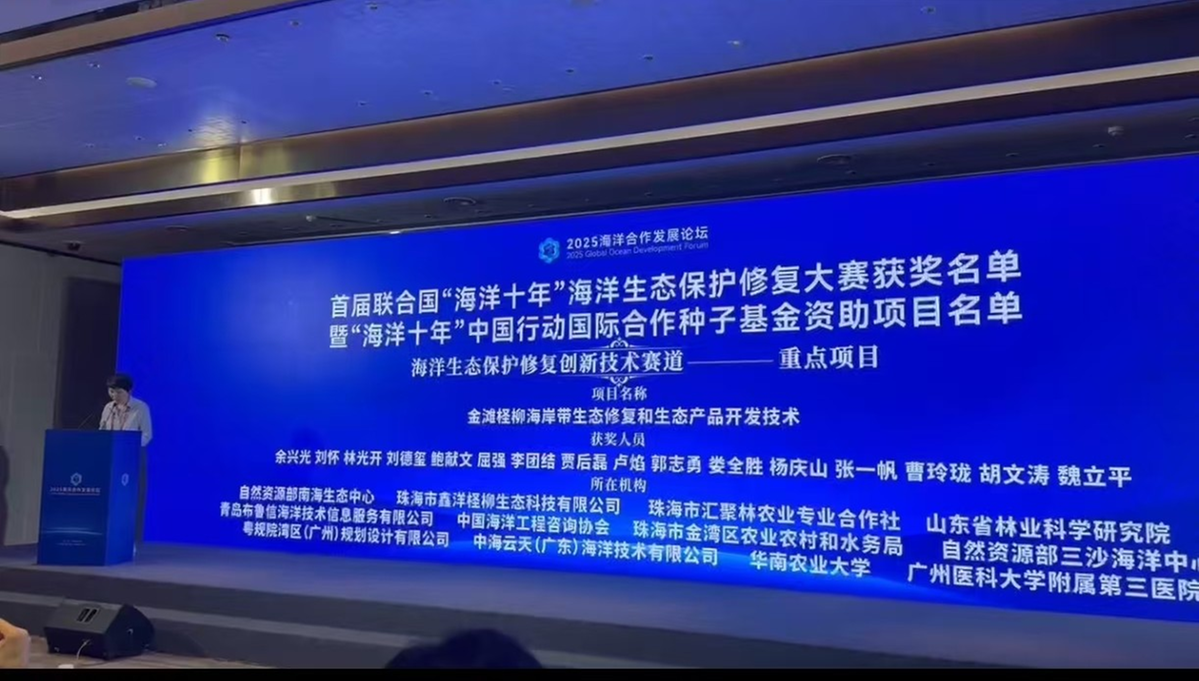 在2025海洋合作发展论坛上,联合国“海洋十年”首届海洋生态保护修复大赛正式揭晓评选结果。珠海市“金滩柽柳海岸带生态修复和生态产品开发技术”项目,荣获“海洋十年”中国行动国际合作种子基金重点项目奖励,并被推荐参加了联合国“海洋十年”海洋生态保护修复成果对接会。对接会向全球展示了中国在海洋生态保护与可持续发展方面的创新成果。