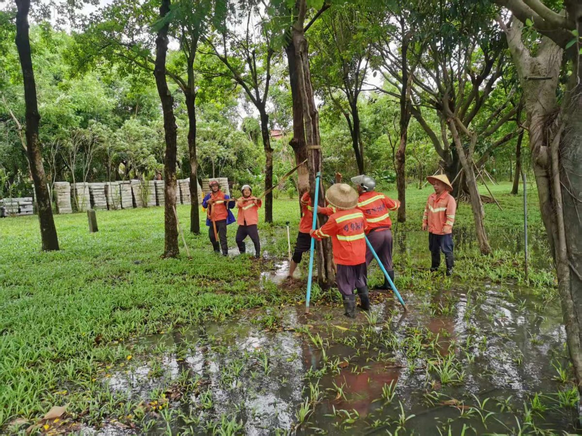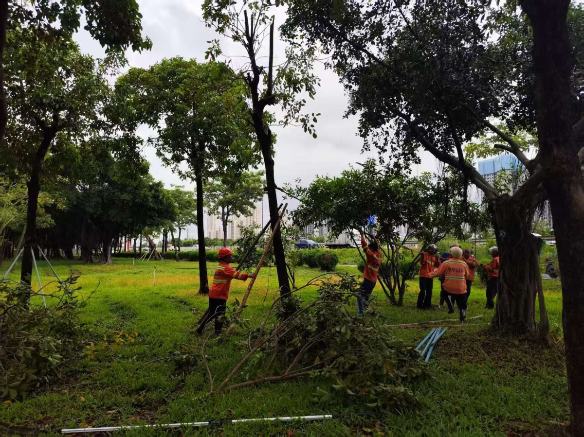 台风过后,市属公园和珠海大道管养单位珠海粤华园林绿化建设管理有限公司和珠海晟华园林建设管理有限公司迅速响应,立即组织专业队伍,投入抢修恢复工作。两公司累计出动150人次、15辆车,连续奋战,争分夺秒,全力开展树木扶正、断枝清理和设施修复工作。共扶正倒伏树木25株,清理断枝140处,对受损绿地和植被进行了紧急修复。同时,迅速更换和修复了海滨公园、野狸岛公园受损的路灯灯罩、海岸砖块、护栏灯等设施。