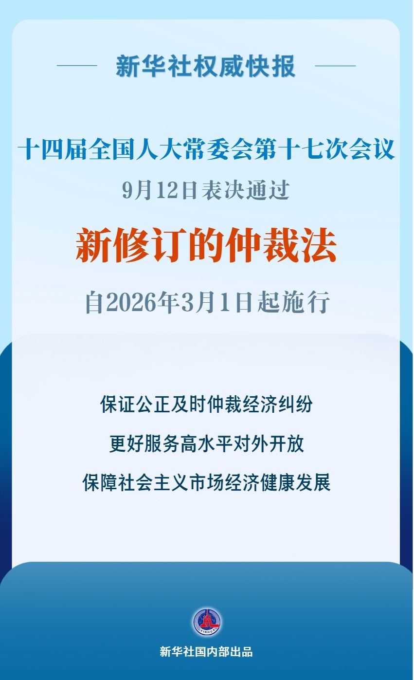 十四届全国人大常委会第十七次会议9月12日表决通过新修订的仲裁法,共8章96条,自2026年3月1日起施行。