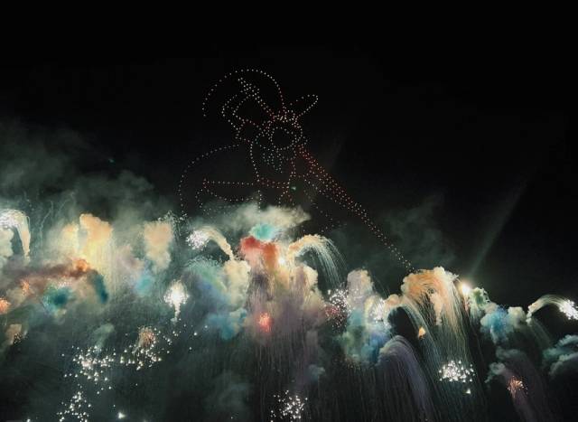 无人机+烟花双秀——点亮稻田夜空,大疆农业无人机队白天呈现“咖啡杯”“稻穗”等编队表演,展现科技农业;夜晚搭配绚烂烟花,浪漫升级。