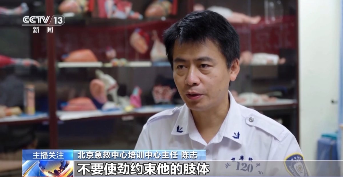 北京急救中心培训中心主任 陈志:在他抽搐的时候,不要使劲约束他的肢体,否则会造成他的骨折。一般来说,这种大发作在几十秒到几分钟就会自动消失。然后尽快等待急救车到现场进行专业救治就可以了。