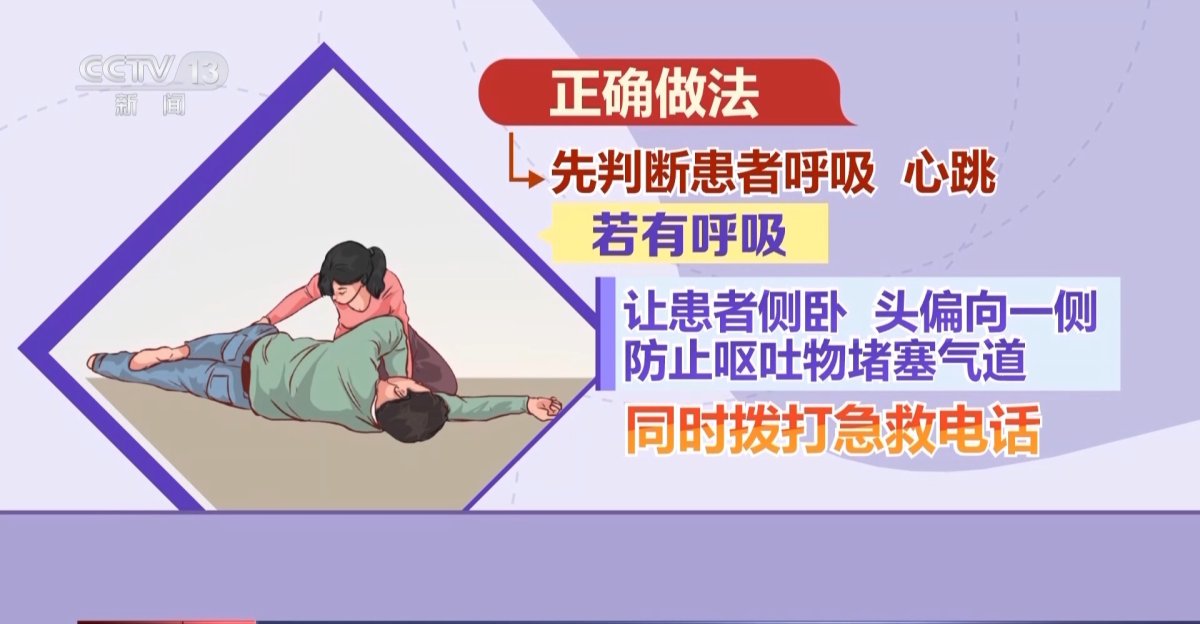 北京大学人民医院急诊内科副主任医师 郭维:如果说家里边出现了一些急性脑血管病,我觉得最重要的首先就是拨打急救电话,如果这个病人出现呕吐,你要让病人身体侧过来,然后避免呕吐物误吸,造成吸入性肺炎阻塞气道。如果说出现昏迷,甚至呼吸不好,你给他身体侧过来的话,其实是有帮助,能够打开气道的。