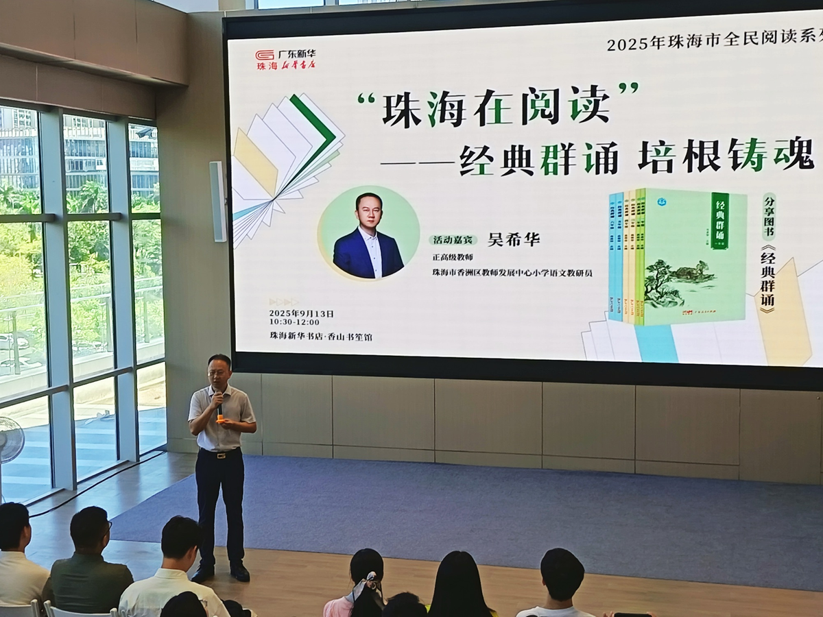 雅言传承文明,经典浸润人生。9月13日,“珠海在阅读——经典群诵 培根铸魂”主题活动在珠海新华书店香山书笙馆举行。活动邀请了珠海市香洲区教师发展中心小学语文教研员吴希华担任主讲嘉宾,为读者分享为何读经典、读什么经典、如何读经典。