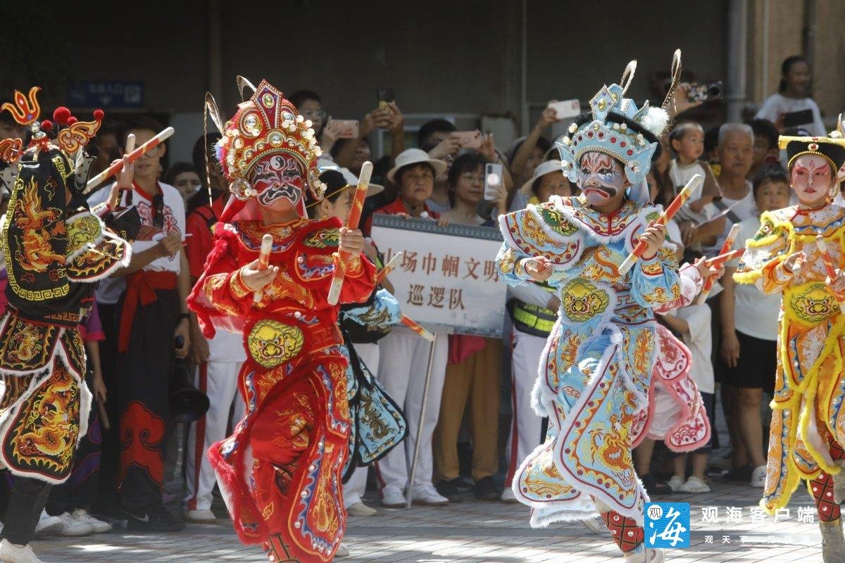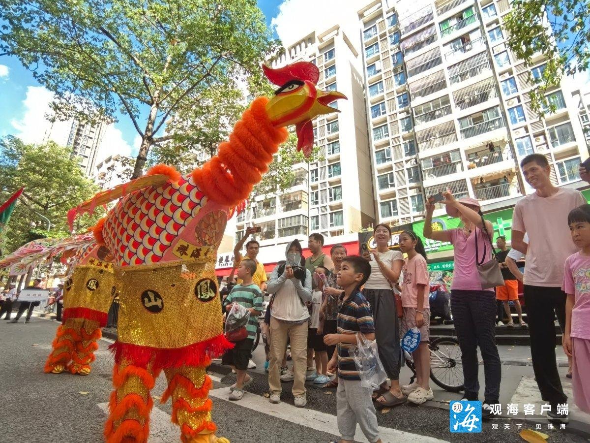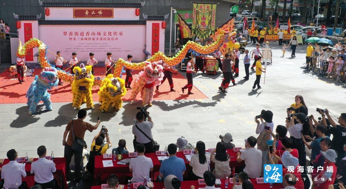9月14日,珠海市香洲区五洲花城二期广场前人头攒动、鼓乐喧天,第三届香山场城隍诞民俗文化活动启幕。当天,凤鸡舞、醒狮、英歌舞等非遗项目轮番上阵,引得附近居民驻足围观,场面热闹非凡。