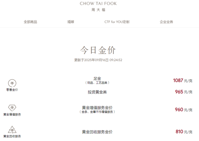 与此同时,国内金饰品牌价格也随之上涨,部分品牌涨至年内最高。中新经纬查询发现,16日,周生生金饰价格为1091元/克,为年内最高,较前一日上涨17元;老庙黄金为1087元/克,为年内最高,单日上涨13元;老凤祥为1086元/克,为年内最高,单日上涨12元;周大福为1087元/克,单日上涨9元。