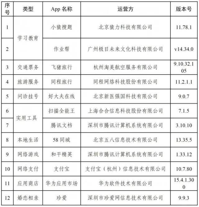 12款App运营方已在应用商店或者官网上架优化改进版本(名单及版本号附后),并承诺升级版本持续保持合规水平。现将App清单公布如下: