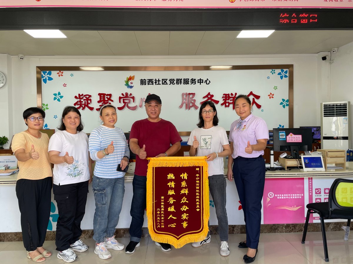 9月12日下午,王女士夫妇专程将一面写有“情系群众办实事,热情服务暖人心”的锦旗送至前西社区党群服务中心,再次对社区工作人员在业务办理过程中所展现出的高效与温暖表示诚挚感谢。