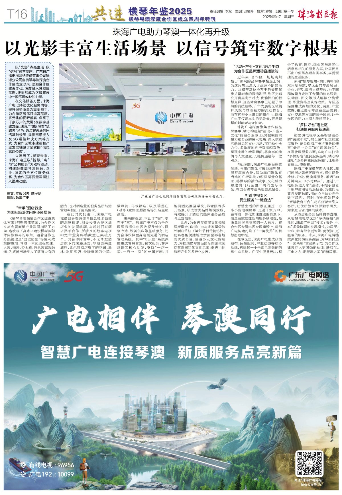 从酒店服务到品牌赛事直播,从智慧电视专区到“多快好省”进社区,珠海广电以“技术+服务+生态”多元协同的发展模式,为居民、企业、游客带来更智能、更便捷、更温暖的服务。未来,珠海广电将继续深化跨境服务融合,为琴澳打造“一国两制”实践新示范、为合作区建设注入更强劲的动能,谱写“以广电之力,助琴澳之美”的新篇章。