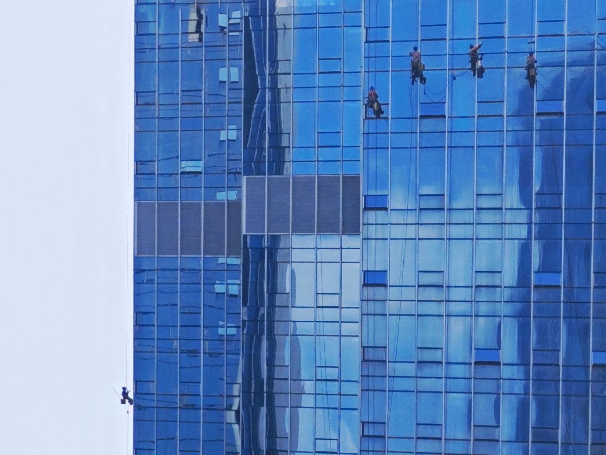 照片故事:在横琴金融岛拔地而起的楼宇之间,有一群身影常年与高空相伴——他们是高空作业的建设者,以绳索为纽带,以云端为“车间”,在数十米甚至上百米高的建筑外墙上书写着奋斗篇章。