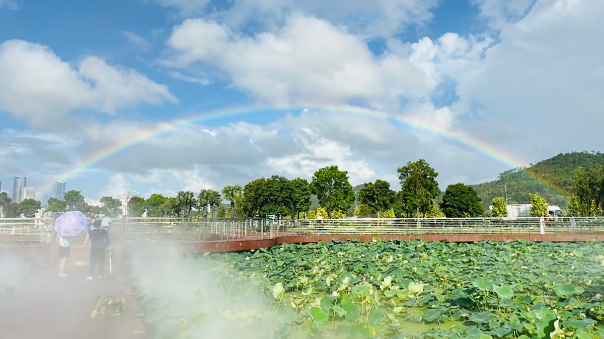 照片故事:某个悠闲的午后,忽然对赏荷花来了兴致,立马动身前往荷花园“打卡”。只见朵朵荷花竞相绽放,引得游客纷纷掏出手机拍个不停。恰好天空出现一抹彩虹,走在花间,仿佛误入荷花仙子醉人的香闺,很是惬意与舒服。