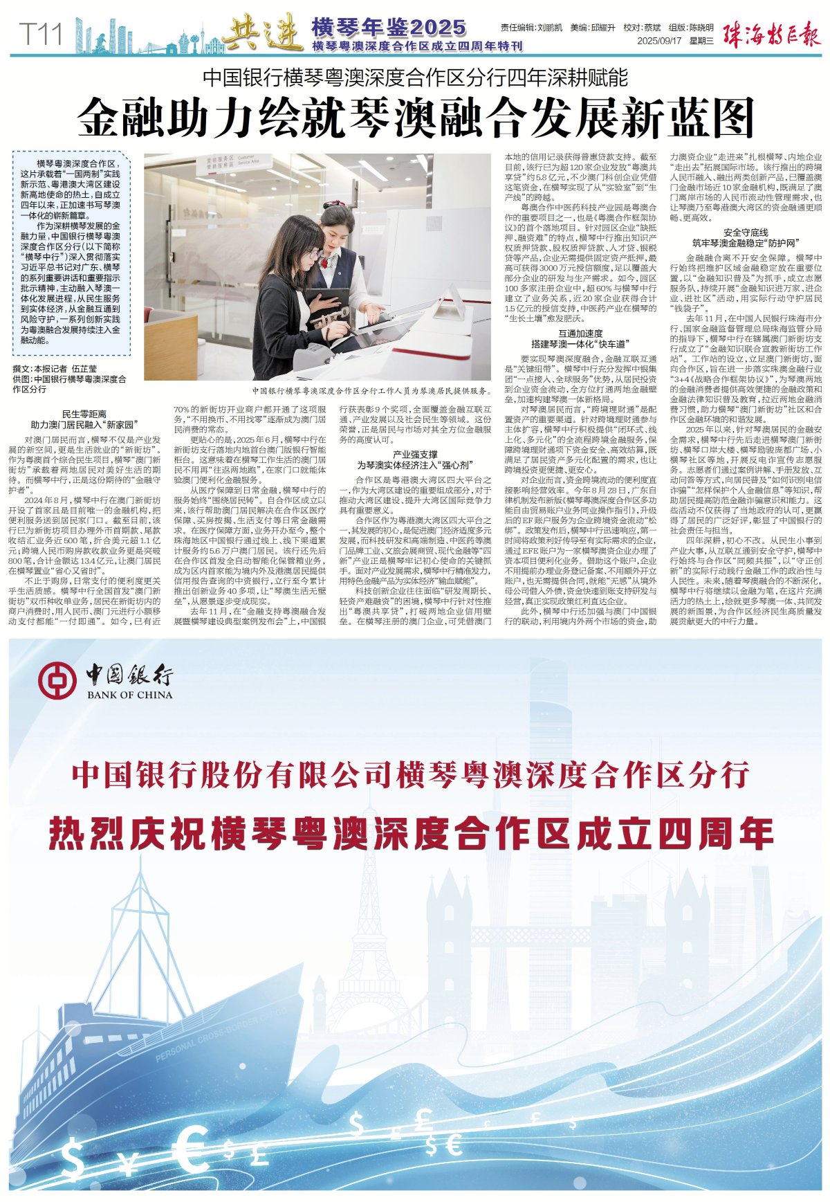 四年深耕,初心不改。从民生小事到产业大事,从互联互通到安全守护,横琴中行始终与合作区“同频共振”,以“守正创新”的实际行动践行金融工作的政治性与人民性。未来,随着琴澳融合的不断深化,横琴中行将继续以金融为笔,在这片充满活力的热土上,绘就更多琴澳一体、共同发展的新图景,为合作区经济民生高质量发展贡献更大的中行力量。