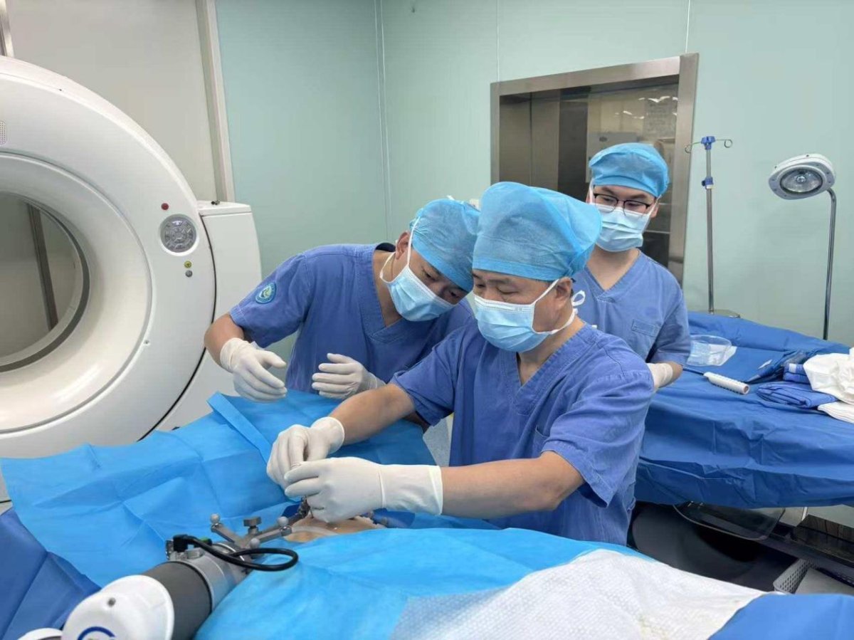 近日,在真健康(广东横琴)医疗科技有限公司自主研发的穿刺手术机器人辅助下,珠海市人民医院(北京理工大学附属医院)呼吸与危重症医学科与介入科团队联合开展珠海市首例“穿刺机器人辅助经皮肺穿刺活检术”。手术全程仅用时15分钟,不仅“一针到位”“零出血、零气胸”,还大幅减少医生及患者接触CT射线。
