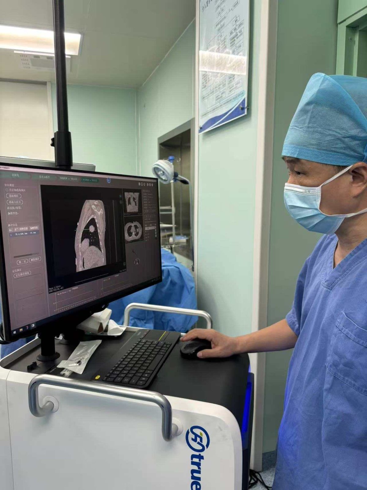 此次接受手术的是一位多发肺结节的患者,不排除特殊病原菌的感染,经呼吸与危重症医学科与介入科团队深入评估和充分准备,决定为其用最先进的穿刺机器人辅助系统进行手术。
