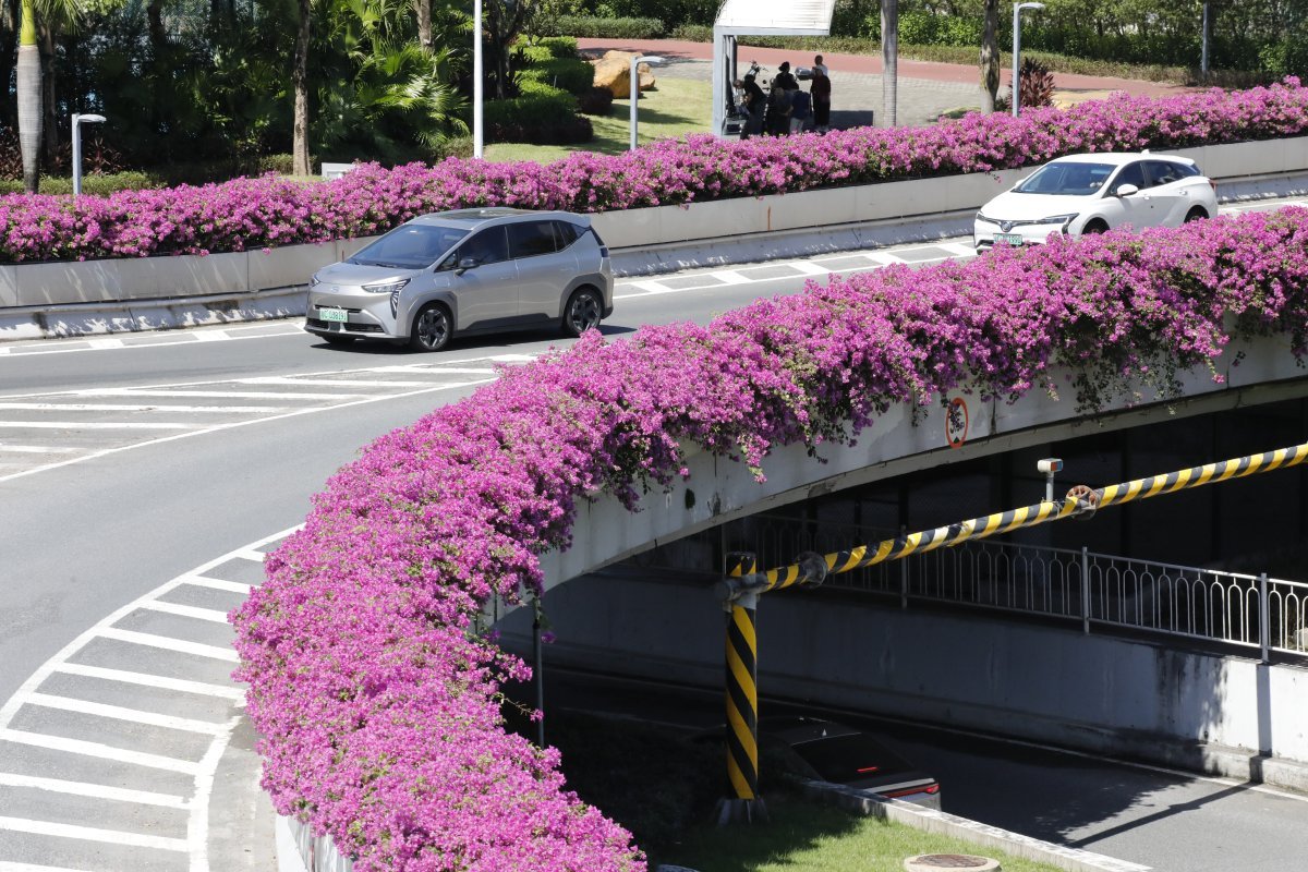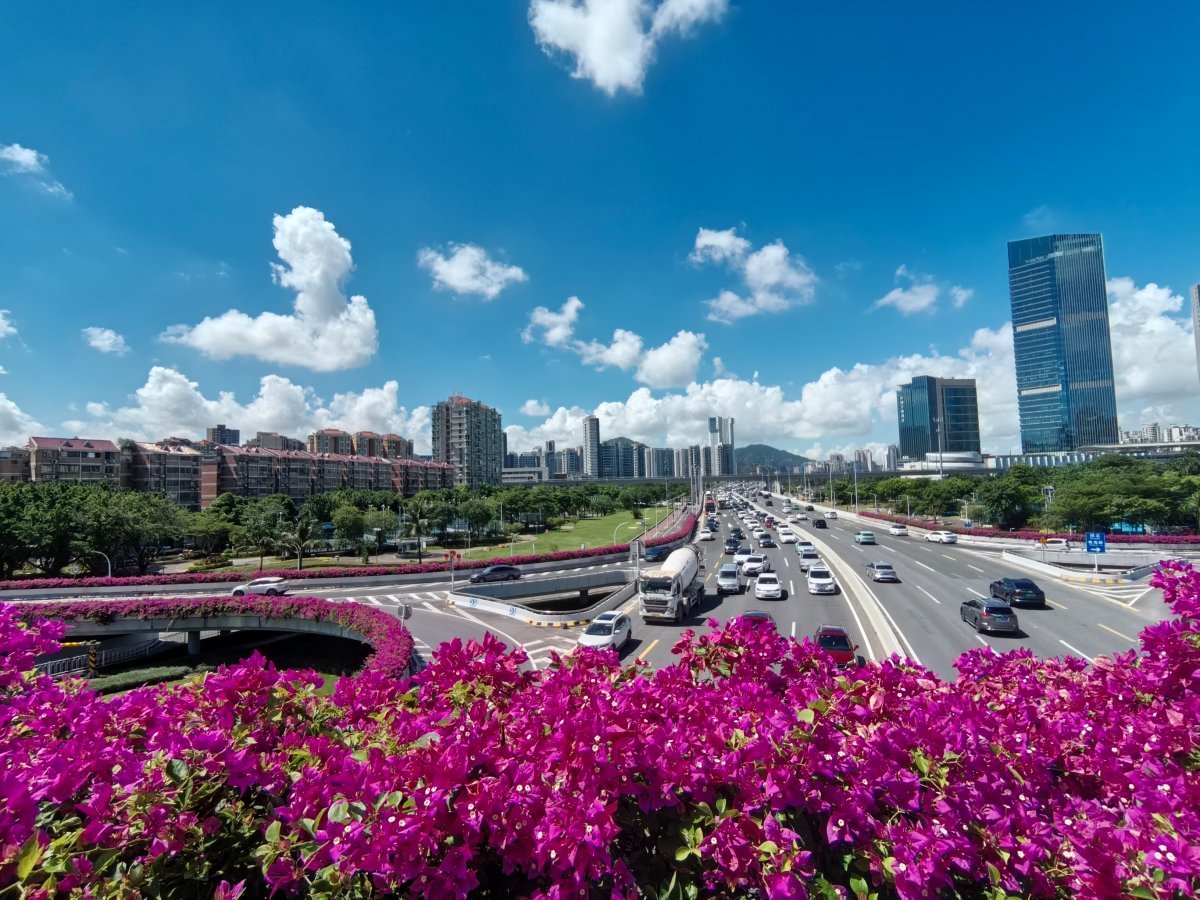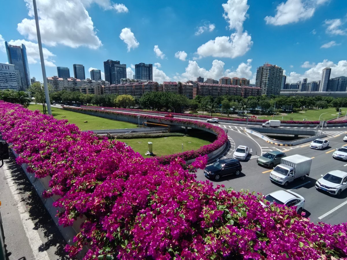 9月的珠海,暑气未消,香洲前山立交桥已被一片绚烂“染红”。桥体两侧的簕杜鹃热烈绽放,花团簇拥着往来车流,绵延2700米的花带如流动花瀑般铺展,成为市民驾车途中举目可见的风景线。