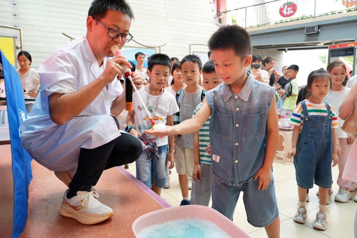 随后登场的两场科学实验秀更是将活动推向高潮。首场围绕空气动力学展开,珠海市科学技术协会科普讲师团讲师赵旺飞老师化身“科学魔法师”,先后演示等离子炮、手掌“着火”、模拟粉尘爆炸等实验。当等离子炮发射出蓝色“能量束”,瞬间击破远处的纸杯时,现场立刻响起一片“哇!”的惊叹声。第二场“泡泡的魔法”实验秀则充满童趣。老师挥舞特制工具,与孩子们一同做出“长龙”泡泡等各式各样的泡泡,当“泡泡烟雾弹”登场,白色烟雾从泡泡中缓缓溢出,现场瞬间被孩子们的欢呼声淹没。