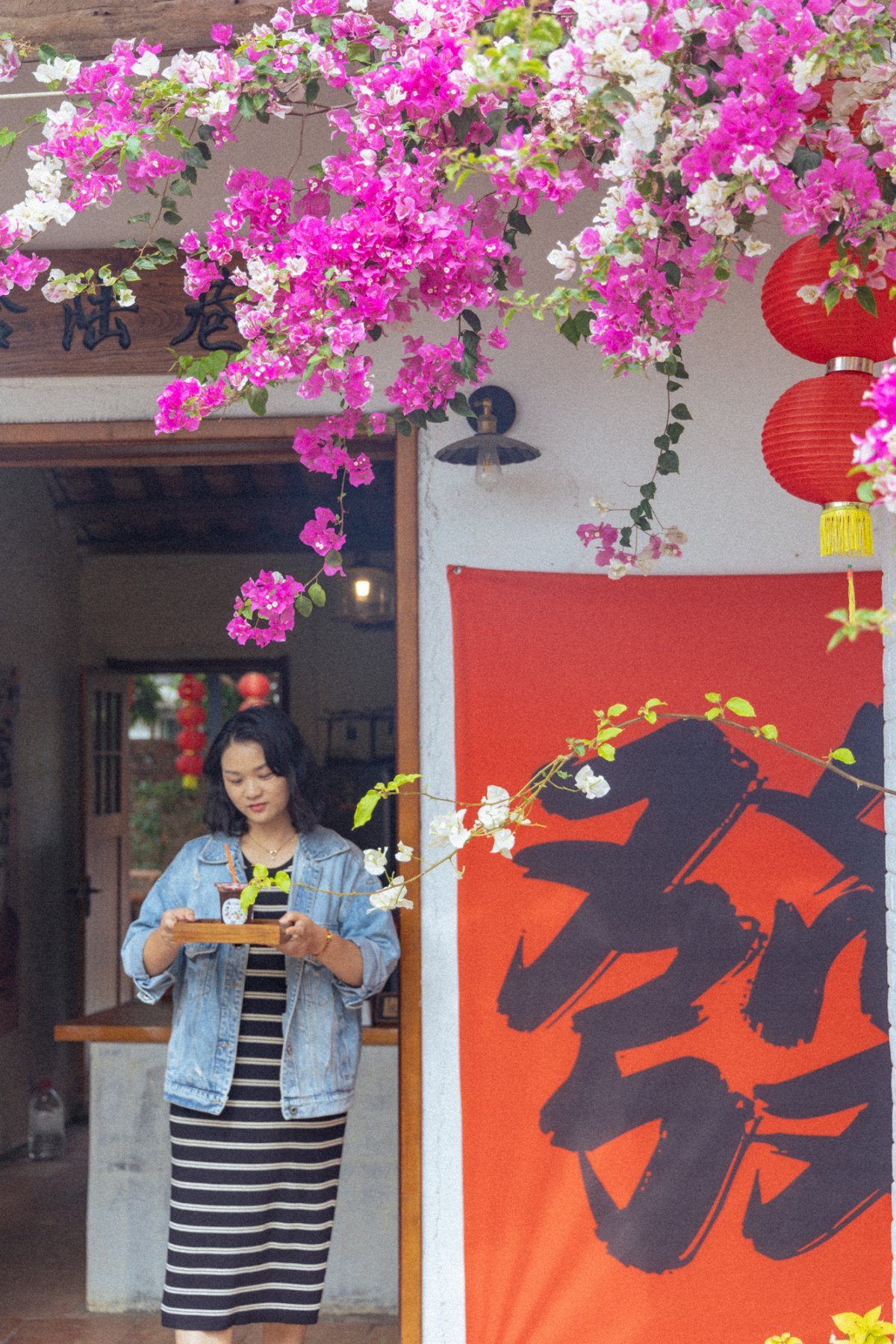 为节省成本,赵丽婷既是装修师傅,也当水电师傅,改造工作一个人包揽。为尽量留住老宅原有特色,主体结构没有变动,只对院墙、门窗、水电等进行“微改造”。这栋闲置的老屋在新时代获得了新生。热烈绽放、爬满墙头、遍及院内的40多个品类的三角梅,成了亮眼招牌。“因为位于上洲村十六巷1号,所以就叫作拾陆巷咖啡馆。”赵丽婷说道。