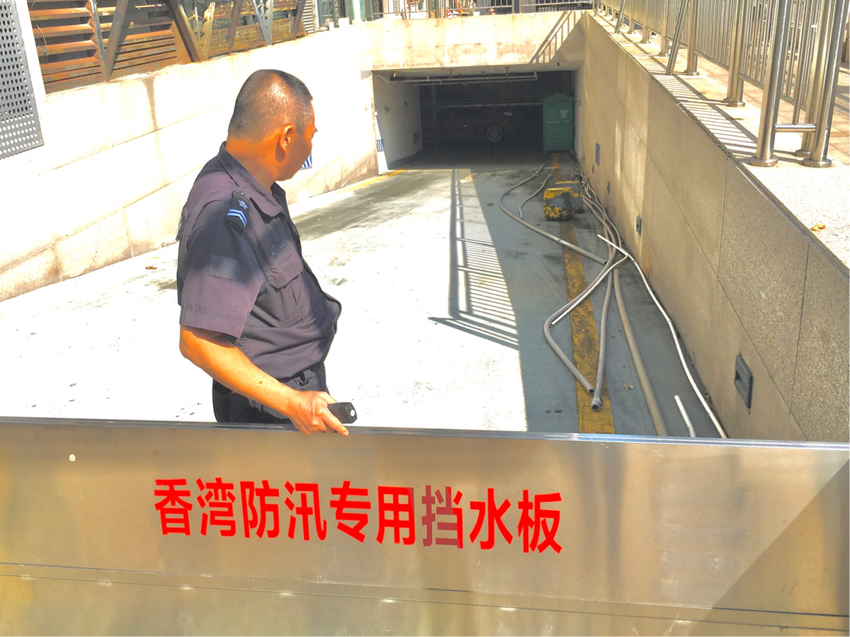 随着台风天气进一步发展,22日,记者根据报料线索还走访香洲近海一些小区。在恒隆·恒福阁小区,靠乐园路一侧有一处地库上行通道,为防止台风极端天气下出现海水倒灌的情况,这里已经架设起防洪挡板;但沿坡面下去却能看到,挡板内侧放置了不少杂物,车辆出口处摆放着大型铁箱,而一些车辆则是直接横在出口位置,泊停摆放无序。如此进行防御准备,令人担忧。
