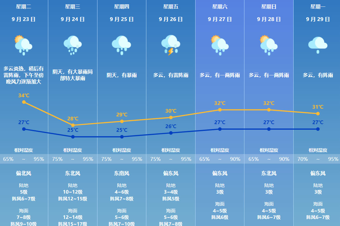 珠海方面,预计今天白天多云炎热,稍后有雷阵雨,下午至傍晚风力逐渐加大;今晚至25日受台风“桦加沙”影响,将有狂风大暴雨。