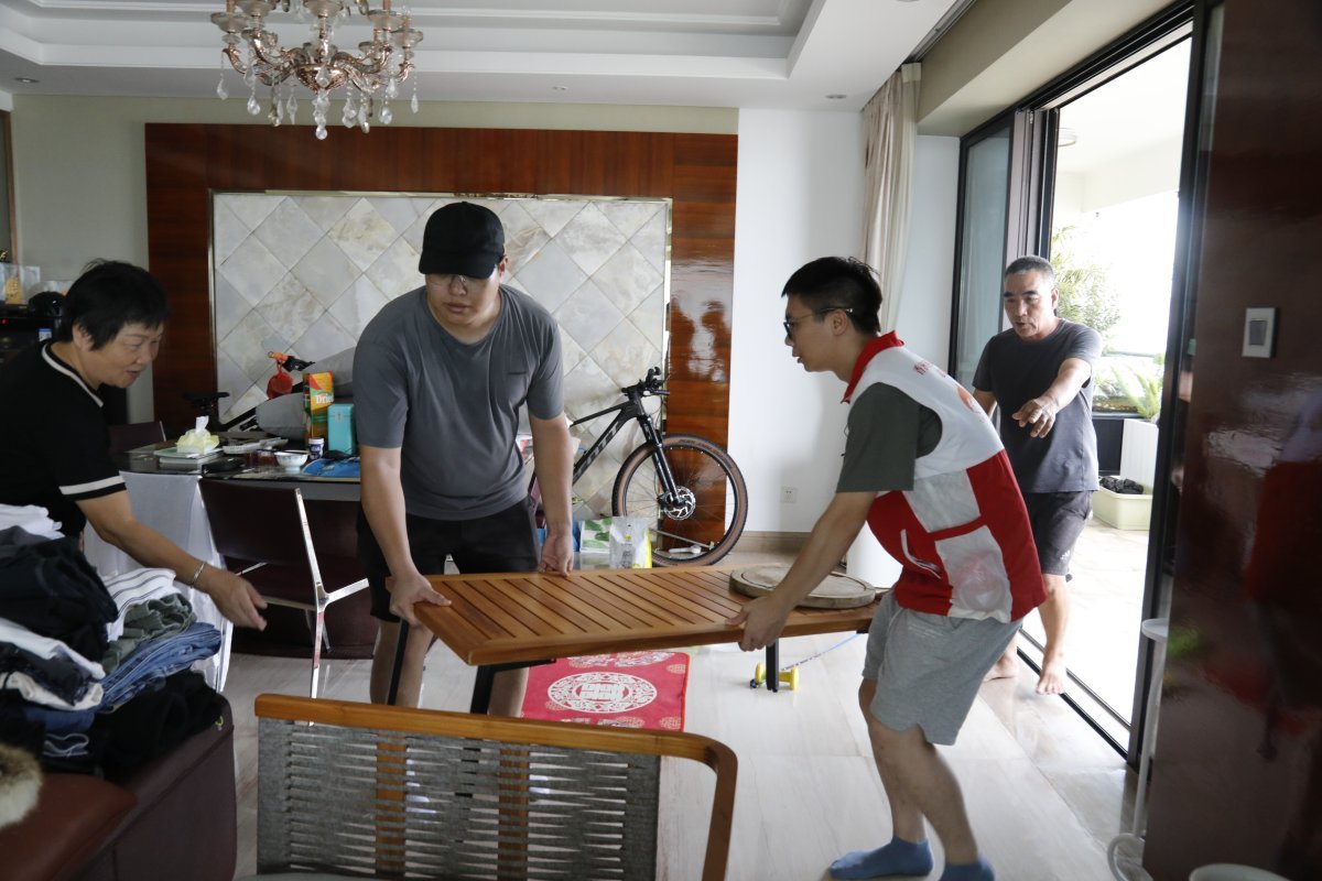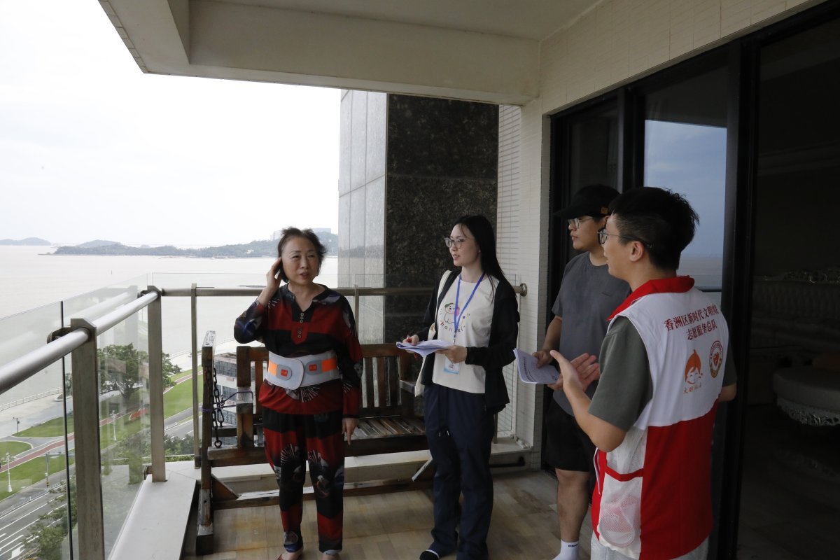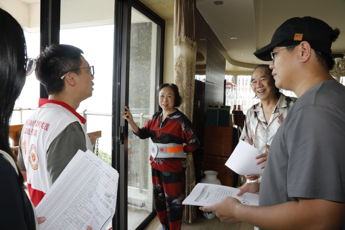 当天15时许,记者来到情侣中路沿线的双水湾小区,此时这个紧邻海岸的小区已被阵阵大风笼罩,风力渐强,路边树木枝叶开始大幅晃动。社区工作人员身着马甲分成多个小组轮流入户,每到一户都耐心向住户说明台风“桦加沙”的避险要求,细致叮嘱撤离注意事项,引导住户安全撤离。