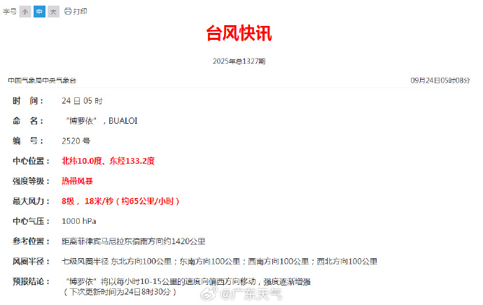 今年第20号台风“博罗依”(热带风暴级;英文名称:Bualoi;名字来源:泰国;名称意义:一种泰式甜品)于9月24日早晨5点钟在菲律宾以东洋面生成,其中心位于菲律宾马尼拉东偏南方向约1420公里的西北太平洋洋面上。预计,“博罗依”将于27日进入南海东部海域,之后向西北方向移动,强度有所增强。