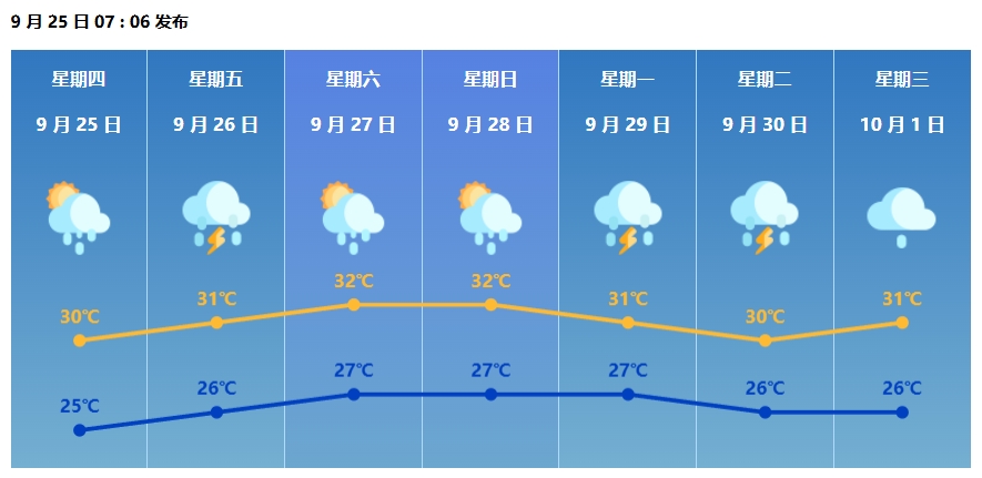 预计今天白天我市有阵雨或雷阵雨,间中雨势较大。预计26-27日阳光阵雨相伴,28日以多云天气为主。
