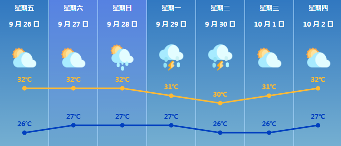 26日,粤西市县有中雨局部大雨,其余市县多云,有分散阵雨。27日,雷州半岛有阵雨局部大雨,其余市县晴到多云,局部有阵雨。28日,粤西市县多云转中到大雨,局部暴雨,其余市县多云,有分散(雷)阵雨。