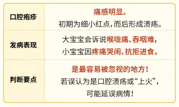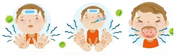 从感染到出现症状约为2-10天,平均3-5天。临床表现多以发热,口腔粘膜出现疱疹,手、足和臀部出现斑丘疹、疱疹为主,可伴有咳嗽、流涕、食欲不振等症状。患儿通常病情症状较轻,呈自限性,一般预后良好,7-10天病程后可完全康复。
