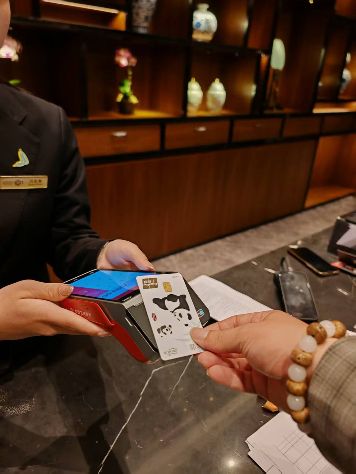 首位体验用户、常往来横琴的澳门青年吴先生,在合作区某便利店使用“卡码通”成功完成挥卡支付,全程仅耗时3秒。吴先生表示:“出示‘回乡证’登记后,马上就能拿到这张卡,使用起来非常方便!大熊猫卡面也很可爱。”