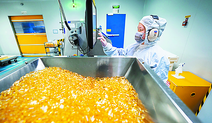 工作人员在人福普克药业(武汉)有限公司生产二十碳五烯酸乙酯软胶囊。