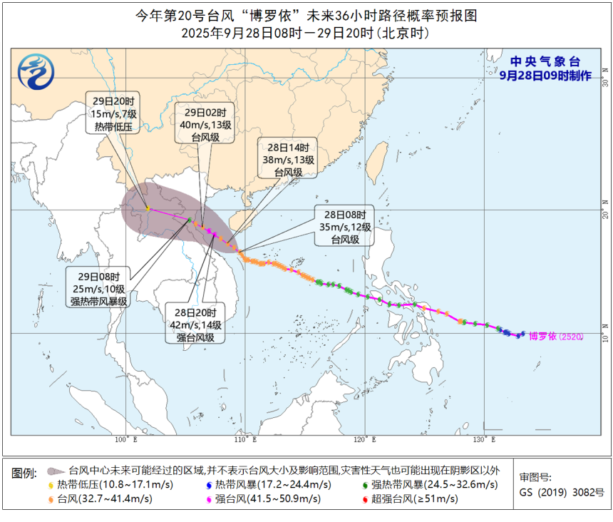 今年第20号台风“博罗依”,28日08时其中心位于北纬16.6度,东经109.5度,也就是位于海南省三亚市偏南方向约185公里的海面上,中心最低气压970百帕,中心附近最大风力12级(35米/秒,台风级)。预计,“博罗依”将以每小时20-25公里的速度向西北方向移动,强度还将略有加强。预计,“博罗依”将以每小时25-30公里的速度向西北方向移动,强度还将有所加强,将于28日白天掠过海南岛以南海面,逐渐向越南中北部沿海靠近,28日夜间至29日早晨以台风级(35-40米/秒,12-13级)在越南中北部沿海登陆,尔后逐渐减弱。
