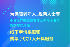 为保障老年人、脱网人士等不便操作的旅客群体获取电子发票,铁路部门增加线下申请渠道和购票人(代办人)开具服务。