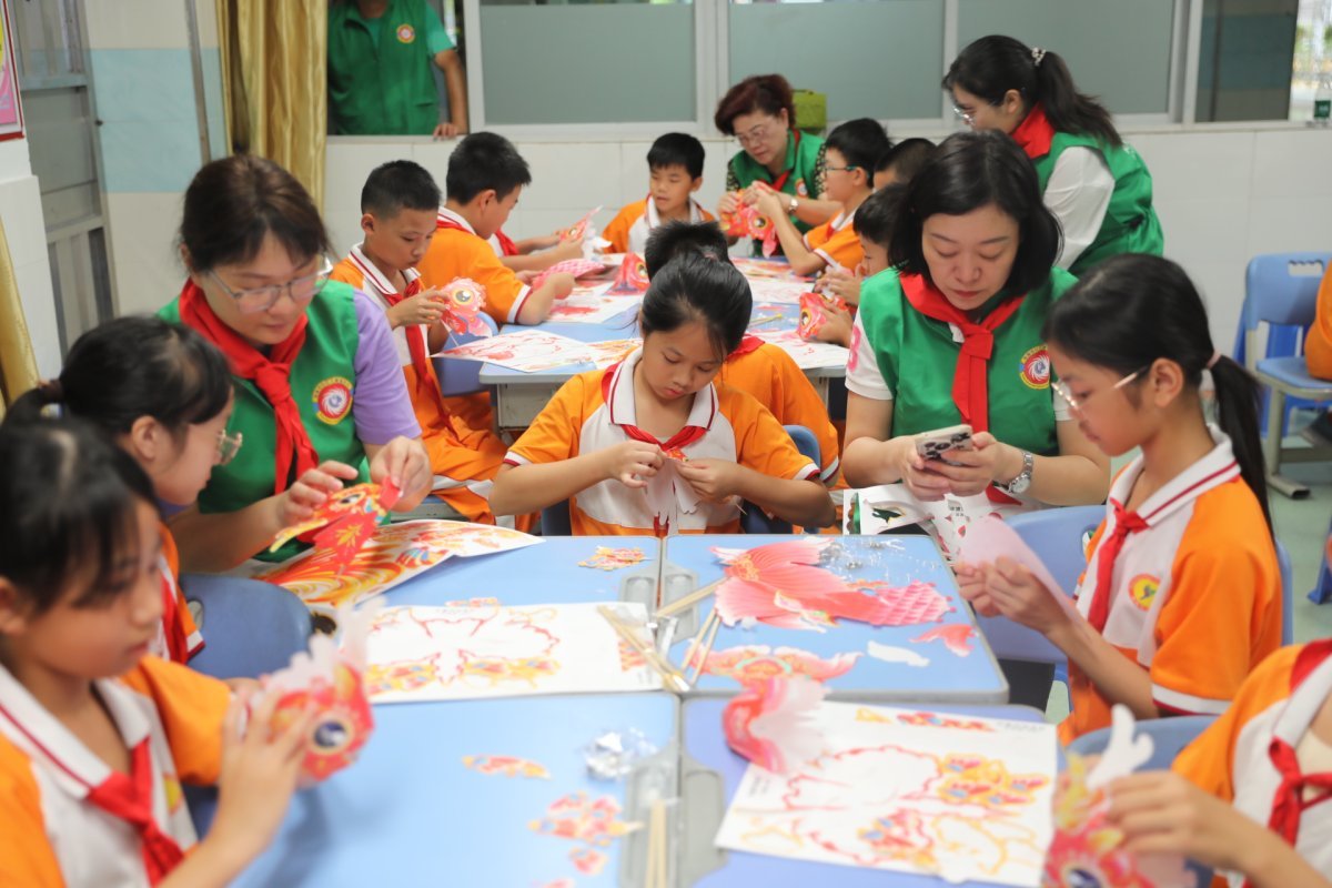 活动最后,孩子们移步音乐教室,在志愿者的指导下亲手制作非遗玲珑鱼灯笼。孩子们认真听讲、细心操作,在动手实践中感受中华传统文化的魅力。