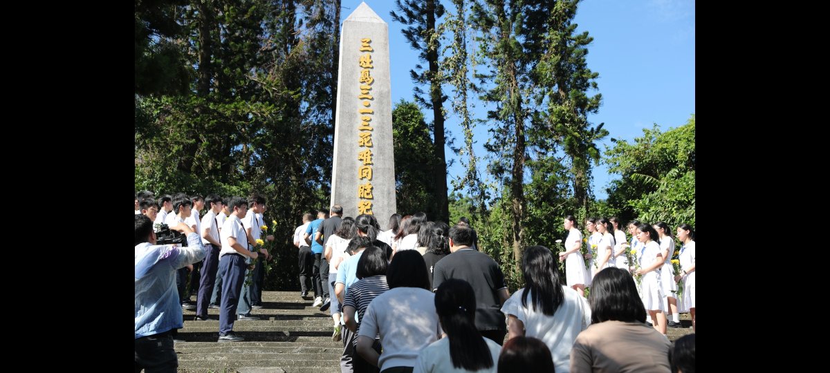 下午2时,师生代表赴国家重点文物保护单位三灶岛万人坟遗址。在万人坟纪念碑前,珠海、澳门两地青少年以鲜花与诗朗诵告慰先烈。金山实验学校初中部的同学们为大家带来现代诗朗诵《三灶万人坟前的誓言》,在深情的朗诵中,表达青春一代对历史的敬畏、对祖国的赤诚。