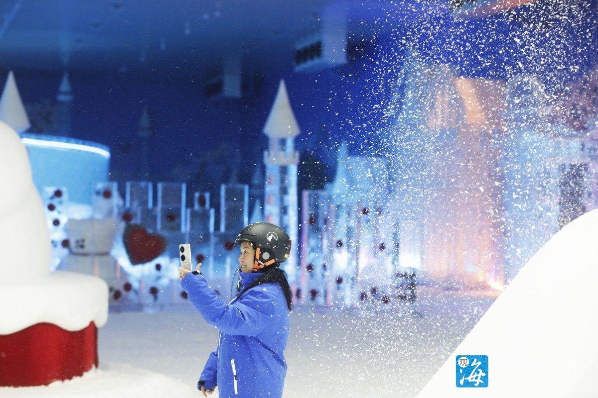 隔温门打开,-5℃至-8℃的冰雪环境瞬间与室外形成大幅温差。场地中央一座憨态可掬的雪人映入眼帘,为游客提供了拍照打卡的点位,一旁的圣诞树覆盖积雪,营造出浓郁冬日氛围。前来体验的滑雪者们穿着专业装备,纷纷在雪人前打卡记录,现场快门声不断。