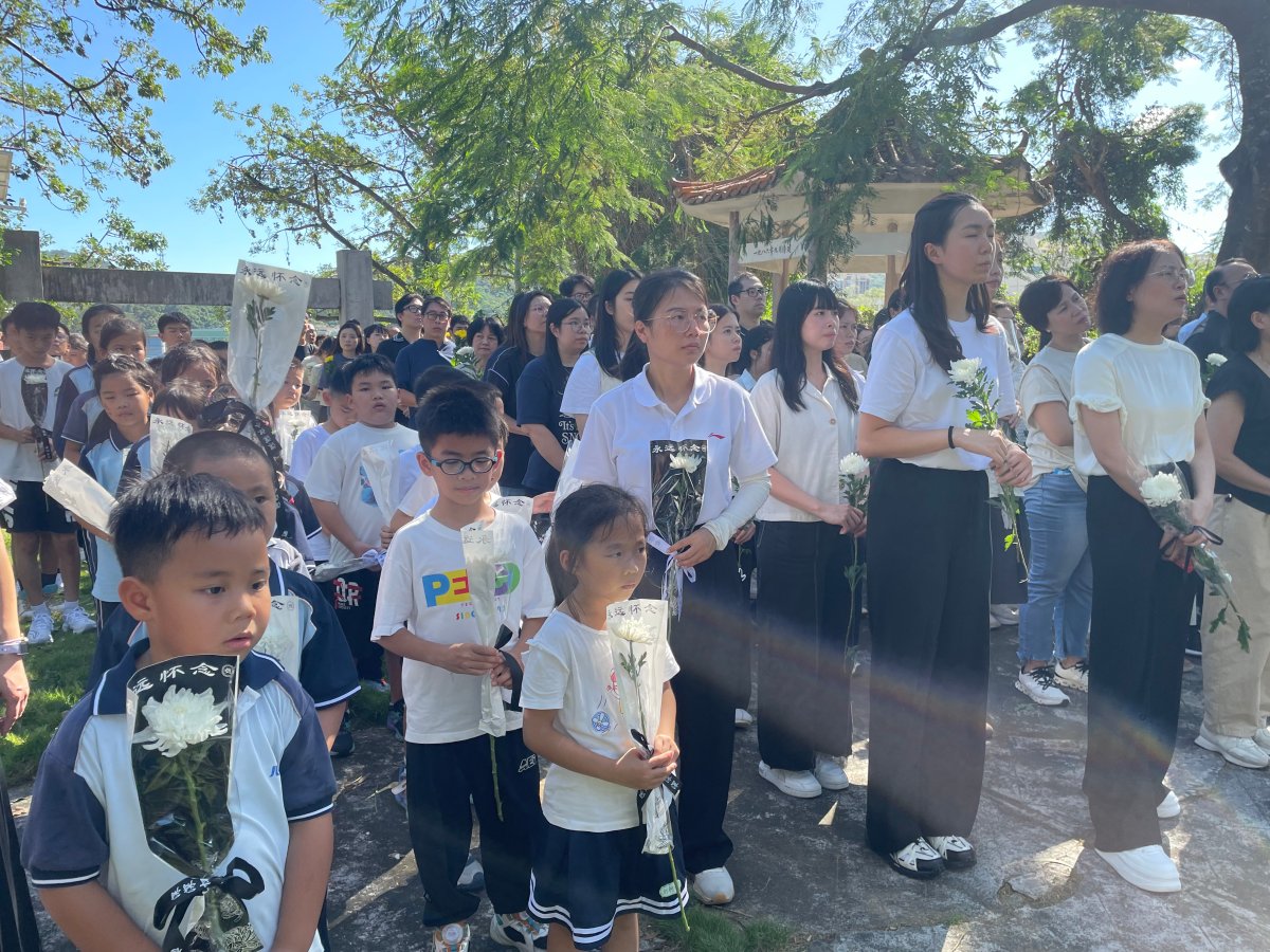 当天下午,社区青少年们怀着崇敬的心情,来到国家级重点文物保护单位——三灶岛“万人坟”遗址。在庄严肃穆的纪念碑前,与澳门的青少年们共同举行了简短的祭奠仪式并敬献鲜花。来自金山实验学校、南水中心小学及澳门劳校中学的合唱团携手献唱了《如愿》《七子之歌》《保卫黄河》等经典歌曲。