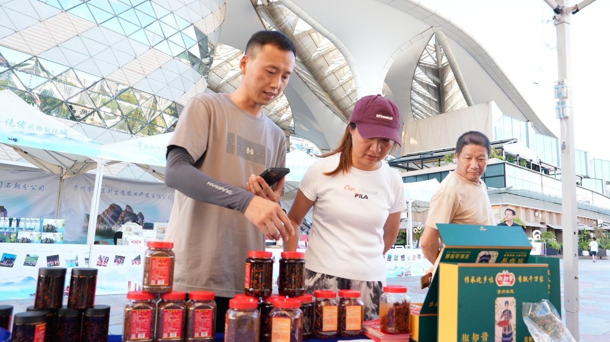 农特产品展售区人气旺盛,20个标准展位整齐排布,务川茶叶、牛肉干、腊肉、豆腐干、蜂蜜、猕猴桃、柑橘、优质大米、菜籽油等特色农产品琳琅满目。参展企业专业销售人员为消费者提供详细产品介绍与优质服务,现场人头攒动,咨询、采购氛围热烈,让务川优质农产品与珠海消费市场得以精准对接。