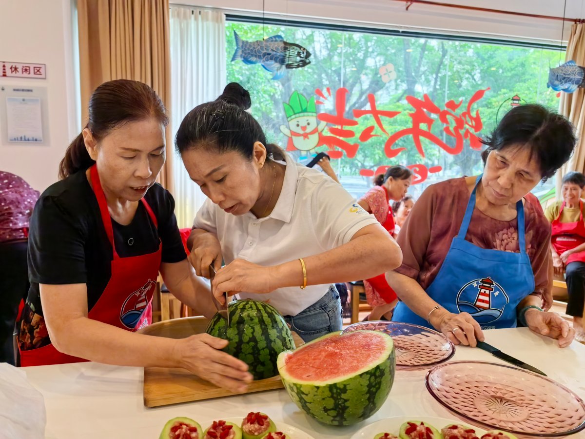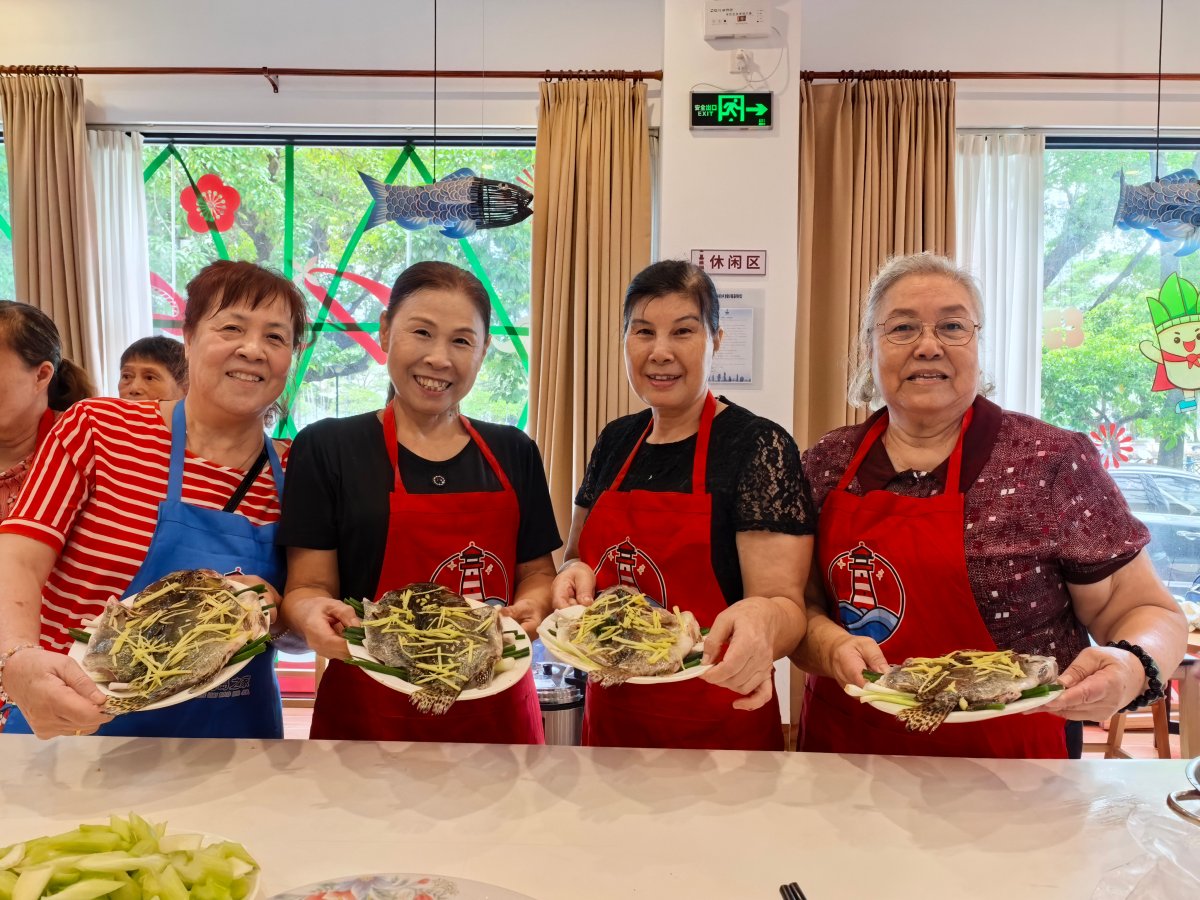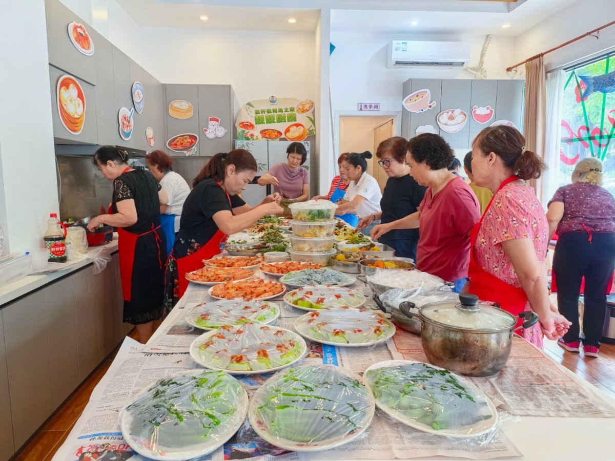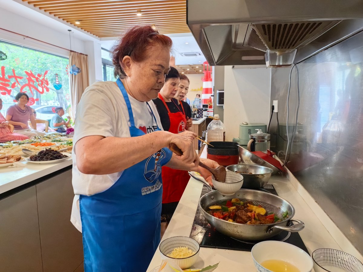 当天一大早,居民们便提着新鲜食材有序入场,默契分工。居民有的负责处理海产、调制酱汁,尽显“老海岛”的烹饪功底;有的分担清洗、切菜等工作,为菜肴制作做好准备;有的则守在汤锅旁,细心把控汤品火候。现场切菜声、翻炒声与谈笑声交织形成热闹的“厨房交响曲”,烹饪香气弥漫整个海岛之家,中秋节日氛围愈发浓厚。