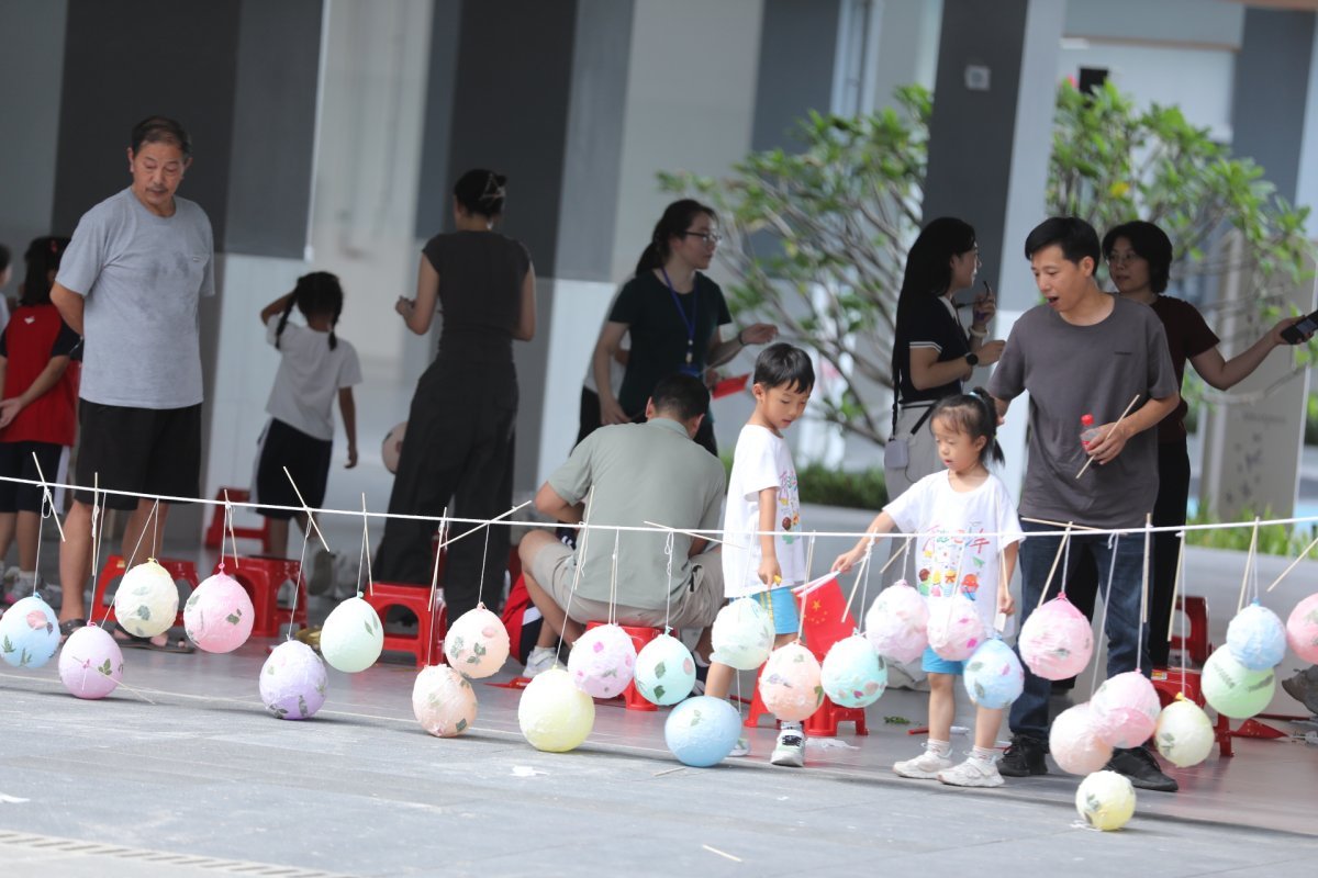 下午的“白鸽寄梦”环节中,家长与孩子们携手参与多项传统文化体验活动。花草灯笼与绒花灯笼制作课上,亲子共同动手,制作出一个个充满中秋韵味的创意灯笼;投壶、滚铁环、抽陀螺、石头彩绘、有奖猜谜等传统游戏区域更是笑声不断,家长与孩子在协作中增进情感,在游戏中感悟文化。