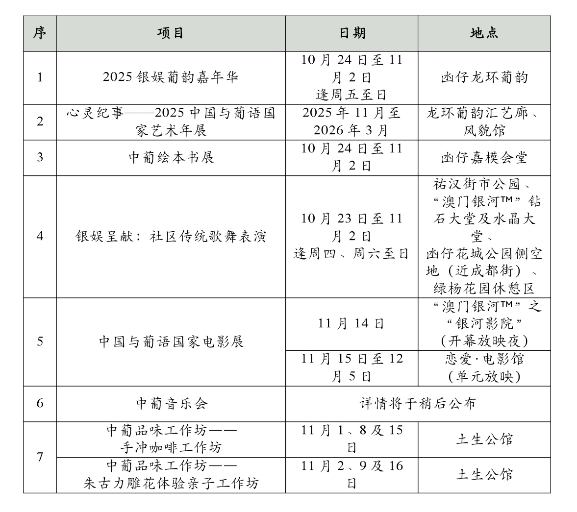 据悉,此次活动由澳门特别行政区政府文化局主办,串联“2025银娱葡韵嘉年华”,并由六大核心活动组成,包括:“心灵纪事──2025中国与葡语国家艺术年展”“中葡绘本书展”“银娱呈献:社区传统歌舞表演”“第七届中国与葡语国家电影展”、中葡音乐会及“中葡品味工作坊”。
