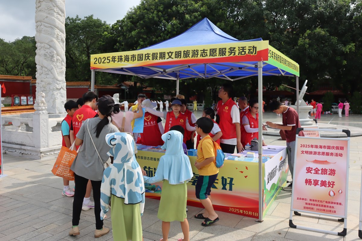 2025年“国庆节+中秋节”长假开始了,珠海迎来大量游客。10月1日,市文化广电旅游体育局、市旅游总会、市旅游志愿服务总队在圆明新园旅游景区正大光明广场开展2025年珠海市国庆假期文明旅游志愿服务活动,志愿者们持续宣传珠海文明旅游良好风尚,引导市民游客文明出行,文明旅游,同时鼓励各志愿服务分队、星级酒店和旅游景区等旅游场所自行开展旅游志愿服务活动。