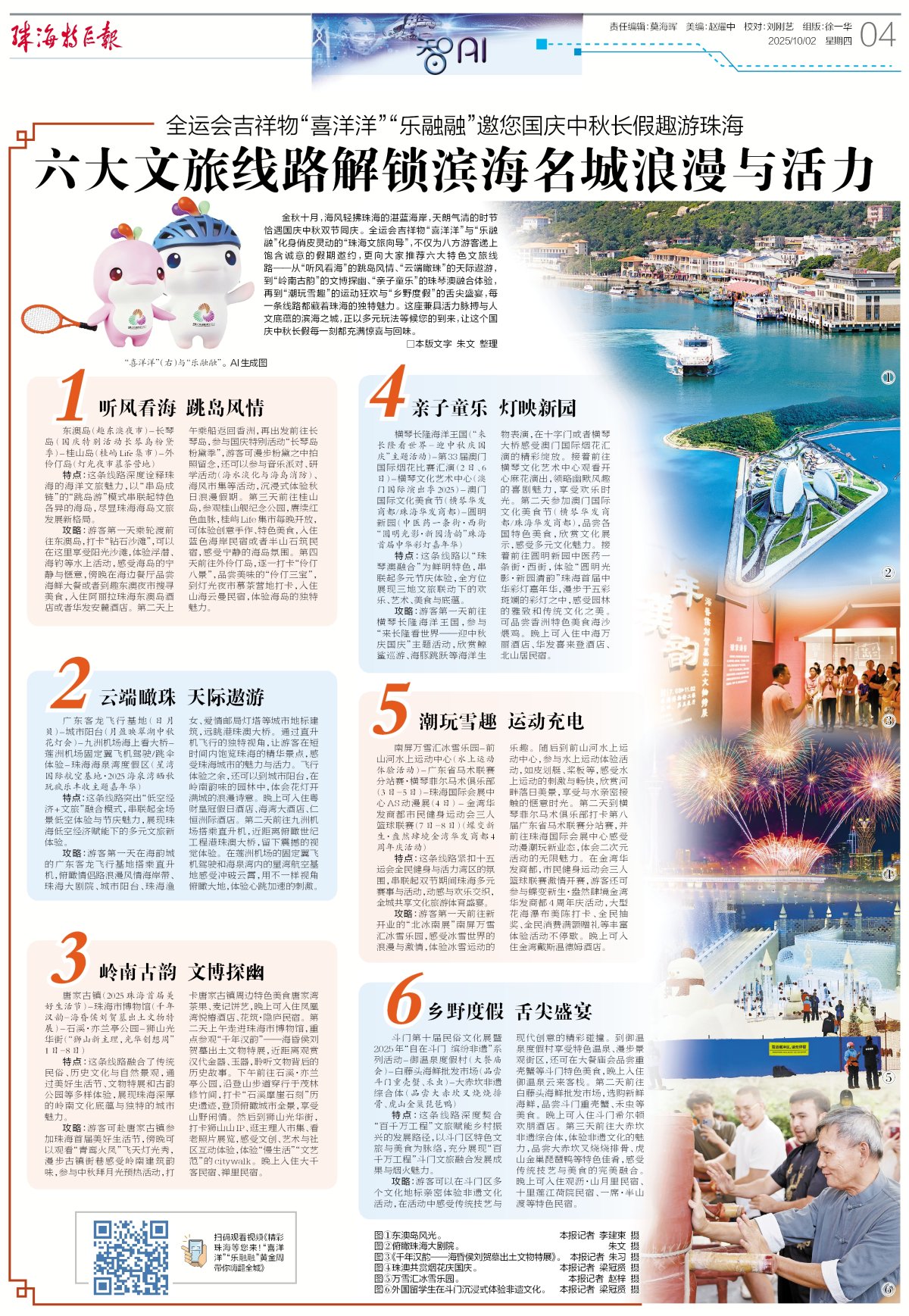 特点:这条线路紧扣十五运会全民健身与活力湾区的氛围,串联起双节期间珠海多元赛事与活动,动感与欢乐交织,全城共享文化旅游体育盛宴。