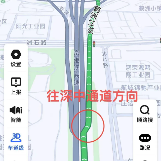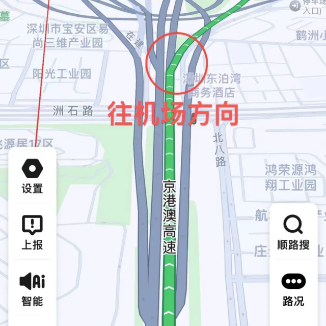 广深高速北行往机场方向有两处关键匝道极易混淆,要特别注意:往深中通道的匝道在前,往机场的匝道在后。